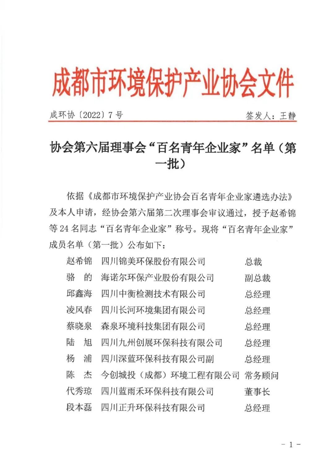 成都市环境保护产业协会于近日公布了协会第六届理事会“百名青年企业家”名单(第一批)和“智库成员”名单(第一批),我司总经理邱鑫海先生均入选。