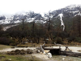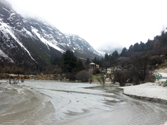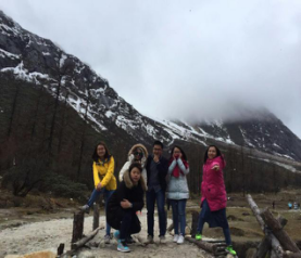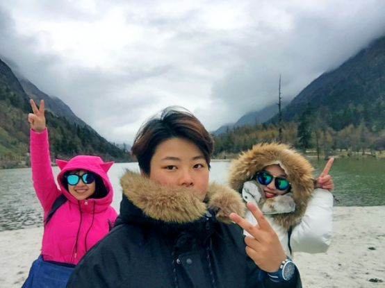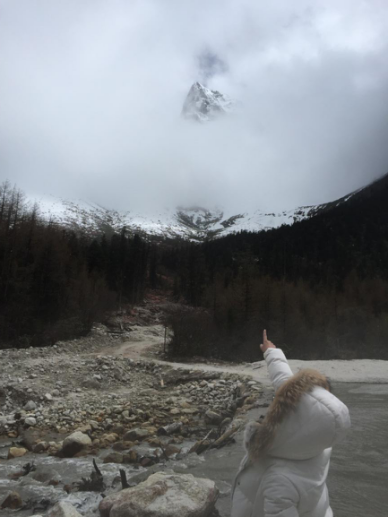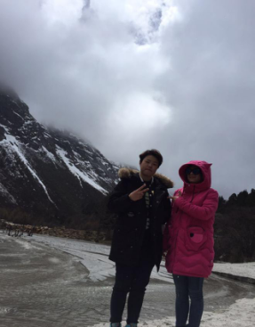从景区门口到第一个景点相距20多公里,共33个急弯道,乘坐观光大巴上去,司机大叔的车技了得,被我们戏称为“秋名山车神”。可是尽管“车神”车技了得,那33道急弯的威力依然不容小觑,毫无悬念的,我们的小伙伴部分晕车了。所幸,不严重。下车,到达景区,看到大雪山的那一刻便激动了,于是开启了我们拍拍拍的模式,一路走一路拍,上山的路上飘着小雪。