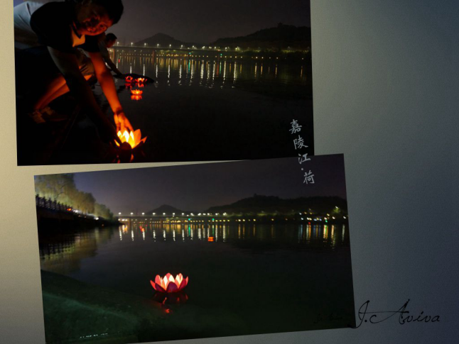 如此夜色,人手一只荷花灯,承载着大伙对生活满满的期待,顺着这一汪江水漂向远方。