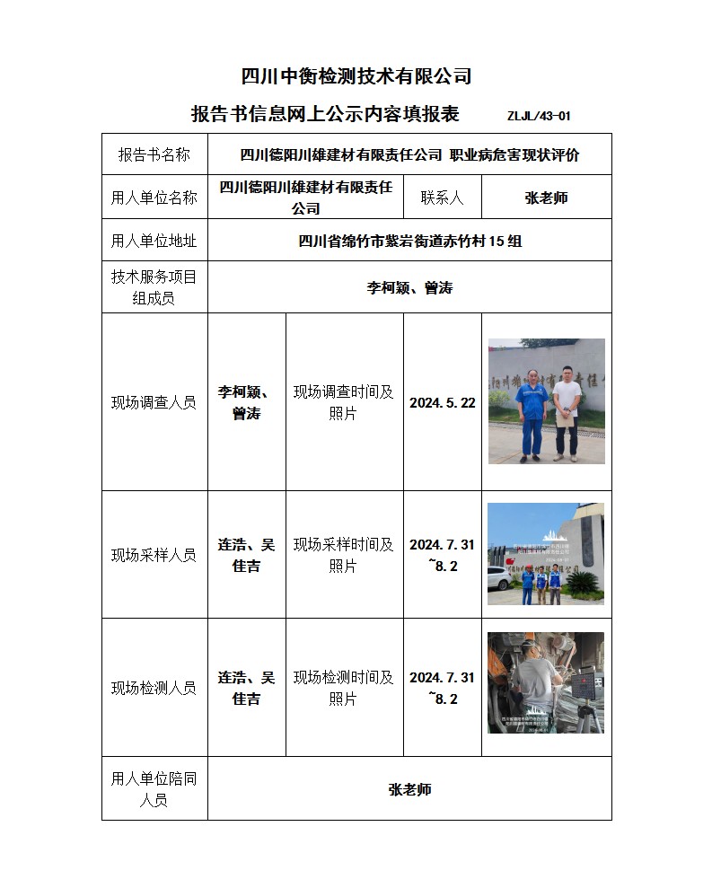 四川德阳川雄建材有限责任公司 职业病危害现状评价报告书