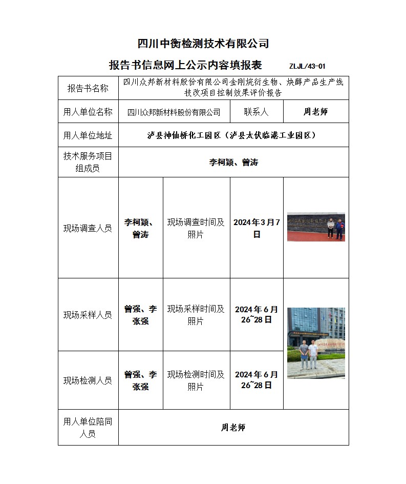 四川众邦新材料股份有限公司 金刚烷衍生物、炔醇产品生产线技改项目 职业病危害控制效果评价报告书