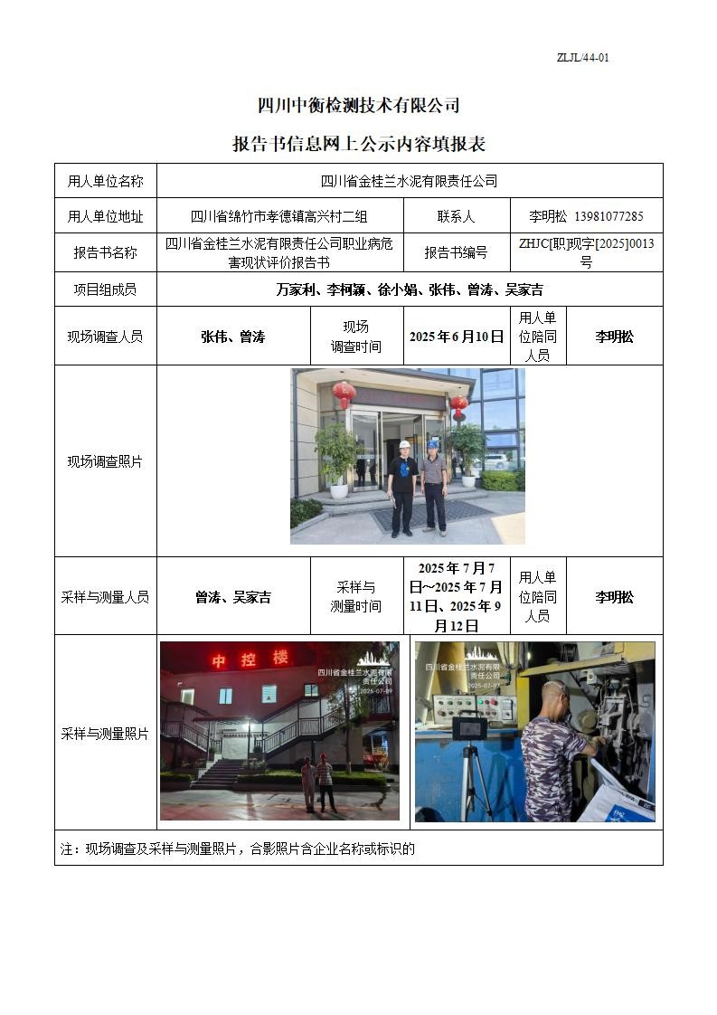 四川省金桂兰水泥有限责任公司 职业病危害现状评价