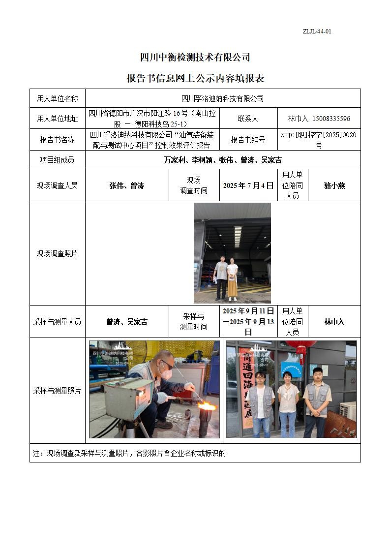 四川孚洛迪纳科技有限公司“油气装备装配与测试中心项目”控制效果评价